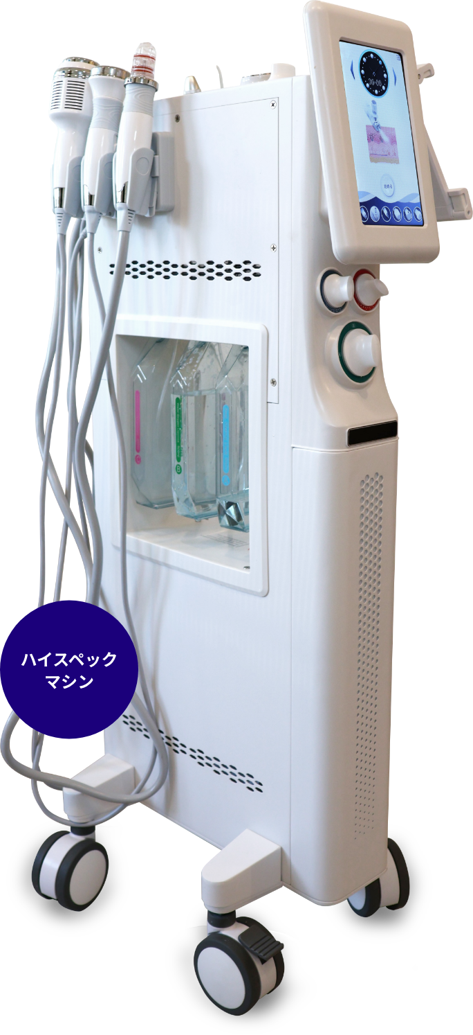 毛穴洗浄ウォーターピールで使用するAHAやBHA溶剤は日本人のお肌に合わせ植物由来の美容成分をたっぷり配合しました。ピーリング後には毛穴の引き締めに冷却プローブ、その他スクライバーや超音波導入、EMS等の組み合わせでリフトアップや美白効果等、あらゆる肌悩みを美肌へ導きます。